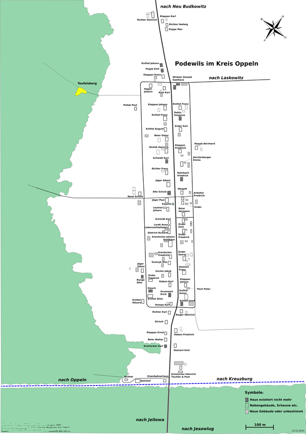 Podewils bestand aus dem eigentlichen Straßendorf, das 1772/73 als Kolonie gegründet wurde und der Holzfällersiedlung / Ortsteil Jesowlug. Der Weiler bestand immer nur aus wenigen Häusern und diente der Holzflößerei zur Kreuzburger Hütte.